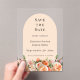 For an elegant and romantic wedding. A clear, transparent background decorated with orange, peach and pink florals. Arch shaped frame. Personalize and add your date, names and details.