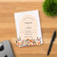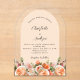 For an elegant and romantic wedding. A clear, transparent background decorated with orange, peach and pink florals. Arch shaped frame. Personalize and add your names and details.