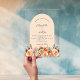Pour une mariage élégante et romantique. Un arrière - plan clair et transparent décoré de fleurs orange, pêche et rose. Cadre en arc. Personnalisez et ajoutez vos noms et détails.