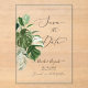 PixDezines variegated monstera, palms, rubber ficus foliage in light and dark forest green and beautiful shade of grey, forest green and ivory. Greenery Save the Date with modern calligraphy script.