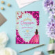 Fuchsia pink, gold and white Quinceanera celebration invitation. Features brunette girl in ball gown dress, script font, gold butterflies, watercolor roses and tiara. Perfect for an elegant princess style glam celebration. Personalize with your own details. Stylish transparent or frosted acrylic invitations.