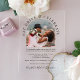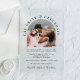 Élégant design moderne, élégant et clair, avec faire-part de mariage privé et invitation à la réception avec votre photo dans un cadre en arc et "Mange Boire & Célébrer" dans une élégante typographie serif. Personnalisez les détails de votre invitation et ajoutez vos noms dans un script de type signature.