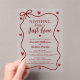 Celebrate your love with a touch of whimsical charm using these "Nothing Fancy, Just Love" acrylic invitations. The design features a playful red ribbon border adorned with small hearts, framing elegant script text that announces your special day. These clear, modern invitations offer a unique and memorable way to share your wedding details with loved ones, setting a romantic and inviting tone for your celebration. Make your wedding stationery stand out with this beautiful and contemporary acrylic design.