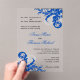 © Socialite Designs Inc. Élevez votre occasion spéciale avec notre invitation à l'acrylique visible personnalisable, avec un design sophistiqué d'angle bleu royal et gris argenté. Parfait pour les mariages, les anniversaires ou tout événement élégant, cette invitation combine transparence moderne et élégance intemporelle. Le coin fleurit et apporte une touche de luxe, tandis que le texte personnalisable vous permet de personnaliser chaque détail pour correspondre à votre style unique. Faites une impression durable sur vos invités avec cette magnifique invitation qui donne le ton de votre célébration.