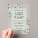 Invite your loved ones to share in your joy on your wedding day with these gorgeous acrylic invitations. The stylish boho chic design features your names prominently displayed in bold letters while the introduction and other notes feature fancy script calligraphy with swashes on the ends of the letters. The text is displayed on a light sage green colored background, while the outside border of the invite is transparent acrylic with hand painted sprigs of eucalyptus leaves and garden greenery decorating the corners. Elegant, classy, sophisticated and beautiful, these wedding invitations are sure to leave a lasting impression.