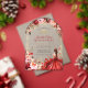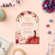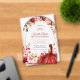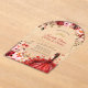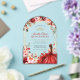 This invitation features a rustic wood-inspired background adorned with vibrant watercolor-style flowers in shades of red, pink, and cream, accented by greenery and gold embellishments. A young woman in an elegant scarlet gown is the focal point, surrounded by whimsical butterflies and subtle sparkling details, creating a sophisticated and celebratory design.