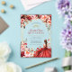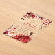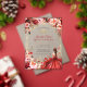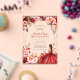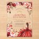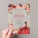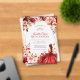 Cette invitation présente un arrière - plan d'inspiration rustique, d'inspiration boisée, agrémenté de fleurs à l'aquarelle éclatantes, dans les tons rouge, rose et crème, agrémentées de verdure et d'ornements dorés. Une jeune femme dans une élégante robe écarlate est le point central, entourée de papillons lunaires et de subtils détails étincelants, créant un design sophistiqué et festif.
