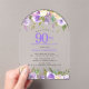Honor a special woman with this elegant and feminine 90th Birthday party invitation that is shaped like an arch. 90th is written in large purple text. Birthday Surprise Party follows. The honored guest's name is also in purple capital letters. The remainder of the text is soft dove gray. The birthday celebration details are surrounded top and bottom purple floral borders. The floral elements are nestled in deep green leaves. While it is a traditional design, the open and airy botanical foliage and text give it a contemporary vibe. Clear acrylic arch invitations are the hottest trend in this year's invitation designs.