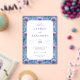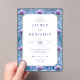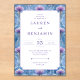 This is a vintage style image featuring an elegant wedding invitation adorned with intricate floral patterns in shades of blue and purple. The central white panel showcases the names "Lauren and Benjamin" along with the details of their special day, set against a backdrop of beautifully illustrated flowers that exude sophistication and charm. It feels like stepping into a serene garden party—elegant, romantic, and full of grace! Perfect for setting the tone for a memorable celebration.