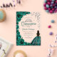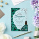 Emerald green silver watercolor floral Quinceanera celebration invitation. Features brunette girl in ball gown dress, script font, silver butterflies, roses and tiara. Perfect for an elegant princess style glam celebration. Personalize with your own details. Stylish transparent or frosted acrylic invitations.