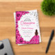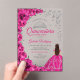 Fuchsia pink silver watercolor floral Quinceanera celebration invitation. Features brunette girl in ball gown dress, script font, silver butterflies, roses and tiara. Perfect for an elegant princess style glam celebration. Personalize with your own details. Stylish transparent or frosted acrylic invitations.