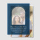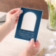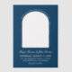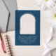Elégant faire-part de mariage en velours bleu profond avec un cadre en arc de cercle peekaboo pour vous permettre de poser une photo romantique de mariée et mariée en dessous avec le libellé mariage informel en blanc contre un bleu cérusé foncé translucide. Polices élégantes et détails délicats en blanc. Faire-part de mariage Peekaboo en vellum avec une forme arc pour votre photo en bleu et blanc.