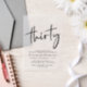 Élever votre 30ème anniversaire avec cette invitation vellum avec "trente" dans un script chic, votre nom dans la typographie serif élégante et les détails de la fête en lettres simples et modernes, Vous pouvez superposer cette invitation sur une photo pour une touche sophistiquée.