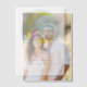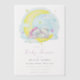 Une charmante illustration à l'aquarelle d'un éléphant bébé dormant paisiblement sur un croissant de lune, entouré de nuages duveteux et d'étoiles pastel scintillantes. La palette de couleurs douces de jaunes, de bleus et de roses crée une atmosphère rêveuse et fantaisiste, parfaite pour une invitation à une fête prénatale. Idéal pour une célébration de bébé fille ou de genre neutre, ce design évoque la chaleur, l'amour et l'anticipation de l'arrivée d'un nouveau petit être.