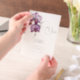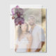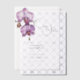 De belles fleurs d'orchidées violettes avec leurs pétales ouvrent une large cascade au-dessus d'un bourgeon qui a éditable calligraphie et des polices audacieuses autour qui reflètent l'occasion et les détails essentiels que les clients doivent connaître sur votre occasion spéciale, Les fleurs sont dressées contre un arrière - plan transparent et transparent (revêtement de vellum) qui annonce sophistication et élégance à la fois aux arrière - plans simples et photo. Idéal pour un couple nouvellement engagé qui cherche à laisser ses amis et sa famille "sauver la date" pour leur grand jour.