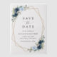 Invitations amis et famille dans le style et donner le ton pour votre journée spéciale avec ce charmant enregistrer la carte de date. Le design présente des fleurs marine et bleu aquarelle, de la verdure et un cadre doré.