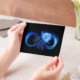 Luminous infinity symbol with glowing, beautiful, lushly blooming rose made of blue flames on black background.