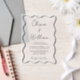 Invitation vellum mariage simple et chic avec un cadre ondulé, les noms de la mariée et du marié dans un script de calligraphie et les détails de votre mariage dans le lettrage moderne. Ajustez la taille de la police de script dans l'outil de conception pour des noms plus longs ou plus courts si vous le souhaitez. Associez-le à votre photo préférée ou à l'un de nos arrière - plans stocks coordonnés en couleur ou en carte photo pour une combinaison sophistiquée et intemporelle (voir nos Arrière - plans pour Collections superposées de Vellum ou envoyez-nous un message pour les liens).