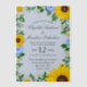 Invitation mariage campagnard rustique avec des tournesols vibrants, marguerites blanches traditionnelles et fleurs bleues colorées contre un arrière - plan bleu clair et poussiéreux avec respiration bébé et des accents de verdure botanique