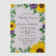 Invitation mariage campagnard rustique avec des tournesols vibrants, des marguerites blanches traditionnelles et des fleurs violettes colorées contre un arrière - plan violet clair avec l'haleine du bébé et des accents de verdure botanique