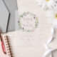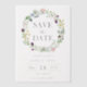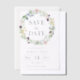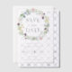 Elégant fleur sauvage couronne vellum translucide mariage de papier enregistrer la date avec un design simple et minimaliste et avec un mélange de script et de polices serif. Le design présente de jolies fleurs et des feuilles verts, parfaits pour un mariage de printemps ou d'été fleuri ou verdoyant. Veuillez vérifier la collection pour les produits de papeterie de suite correspondants.