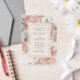 Ces magnifiques invitations de mariage en vellum botanique présentent des roses d'aquarelle rose romantique, avec un cadre en faux or. Il y a aussi la calligraphie de script moderne et le texte classique.