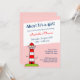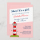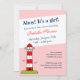 Invitations nautiques de douches pour bébés| phare. Des invitations maritimes aux couleurs pastel avec des tours de maison et des dessins animés d'oiseaux de mer. Illustration de la scène côtière pour les nouveau-nés.