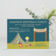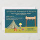 Ce invitation de fête d'anniversaire de 5 x 7 garçons a un joli thème de camping. Il y a un garçon blonde aux cheveux debout à côté d'un feu de camp avec son sac de couchage à ses pieds. Dans le arrière - plan, il y a une tente verte avec une lanterne, un hot dog sur un bâton, et un marshmallow sur un bâton à l'avant. Sur la droite, il y a une bannière avec le nom du garçon d'anniversaire que vous pouvez facilement personnaliser. En haut et à gauche, vous pouvez customiser toutes les informations sur la fête d'anniversaire. © 2012 Illustrations Jessica Weible/JW