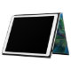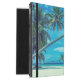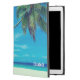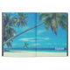 Une coque ipad personnalisée avec une photo à thème tropical avec des cocotiers s'étirant sur une plage de sable blanc isolée. Eaux turquoise et ciel bleu azur en arrière - plan.