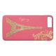 Glam iPhone 7 Plus coque, avec une parties scintillant aux tons dorés et brillants, en forme de silhouette de la Tour Eiffel, face à un arrière - plan rose corail. Personnalisez le texte doré jaune, pour vous-même ou comme une excellente idée cadeau.