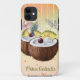 iPhone 11 Coque avec un Coconut Pina Drink design avec ananas, crème fouettée et parapluies. L'arrière - plan est en mélange jaune pastel et oranges. Merci à Hungryjpeg et Creative Fabrica pour certains des éléments du design.