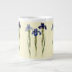 Trio d'iris bleu et violet sur une tasse jumbo jaune pastel.