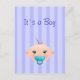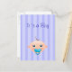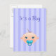 Un faire-part de naissance mignon aux nuances bleues, un visage mignon de bébé de garçon avec une tétine sur un arrière - plan rayé en pastel bleu.