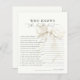 Elégant arc blanc en ivoire "Who Knows the Bride Best" carte de jeu avec typographie de script chic sur un arrière - plan propre. Parfait pour ajouter une touche interactive et amusante à une douche nuptiale, une wedding shower ou une bachelorette, surtout pour les fêtes à thème arc ou noir et blanc. Les clients répondent à des questions légères sur la mariée, ce qui en fait un souvenir mémorable. Coordonnée avec des invitations assorties, la signalisation et les accessoires de fête dans le même design d'arc en ivoire.