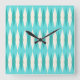 Cette horloge murale en acrylique Jacquard moderne du milieu du siècle (en petits caractères) est ornée d'un arrière - plan turquoise et dynamique et d'un motif de diamants turquoises mod et translucides recouvrant de plus gros diamants vintages de couleur or et des pointes d'âge spatial. Ce Jacquard minimaliste d'inspiration et déconstruit est un retour simpliste de l'ère atomique plus grande que la vie qui a dominé le paysage décoratif des années 1950 et 1960. Ce design kitsch rappelle tout, des panneaux de bowling rétro Palm Springs aux plateaux de télévision que vous utilisiez chez votre grand-mère.