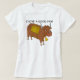 "J'aime un bon yack" un yak souriant joyeux avec des sacs attachés au dos. Style dessin, brun, yak aux cheveux longs.