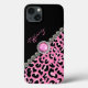 Galaxy Samsung glamour Note 4 coque fait en noir, avec une impression jaguar rose et noir tacheté en diagonale sur le côté inférieur droit du coque. Les graphiques d'une bordure en diamant, sur le bord de l'impression jaguar, a un bijou rose et argent, au milieu. Personnalisez le texte rose pour vous-même ou en tant qu'idée cadeau.