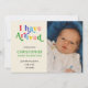 Je suis arrivé ! Des lettres colorées et amusantes annonçant la naissance de votre nouveau bébé et montrant votre photo préférée de votre nouveau bébé! Customisez ce design avec votre photo, le premier, le milieu et le nom de famille du bébé, la date de naissance, l'heure, le poids et la longueur.