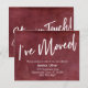 Gardez vos amis et votre famille à jour avec votre nouvelle adresse en utilisant ces cartes faire-part simples et élégantes. Que vous soyez marié(e) ou que vous souhaitiez simplement un design unique pour que votre tribu sache comment vous trouver, cette carte est suffisamment polyvalente pour n'importe qui. Il présente de jolis graphiques typographiques qui lisent "I've Moved" sur le devant et "Stay in Touch!" sur le dos, en utilisant une police de script moderne, décontractée, manuscrite. Utilisez les champs modèle pour ajouter tous vos propres détails afin de personnaliser ce design pour votre propre usage. Le type blanc a été placé sur un arrière - plan de grunge vintage rouge profond texturé. Si vous préférez remplacer cela par une autre image arrière - plan, c'est aussi possible ! // 105 //