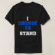 Un T-shirt sombre avec un texte simple blanc et bleu dit : "Je choisis de rester debout", en référence au fait de me tenir pour l'hymne national.