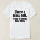 Ce "je le T-shirt ai que ceinture noire" est pour les personnes qui ne prennent pas la vie trop au sérieux, et pour les personnes qui font. Oui, il atteint un démographique ÉNORME ! Les caractéristiques de conception rocailleuses, l'écriture noire qui indique, "j'ai une ceinture noire." Dans une plus petite copie, elle indique, "je la porte avec mes chaussures noires." Si vous ne seriez pas attrapés utilisant complètement une ceinture noire avec les chaussures brunes, ou si vous êtes des arts martiaux experts avec un talent pour la mode, vous voudrez commander ce T-shirt.