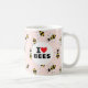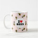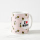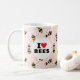 Pour l'apiariste en herbe, fervent jardinier ou entomologiste de voisinage, cette tasse montre une passion pour les pollinisateurs avec le texte classique "I Heart Bees" sur un cercle blanc sur un motif d'abeilles illustrées et à l'air amical sur un arrière - plan rose pâle doux.