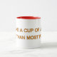 J'aime plus une tasse de joe que la plupart des gens (© Mira). Humour de café pour un collègue qui peut se moquer, ou un bon ami qui accepte d'être légèrement antisocial. Si vous avez aimé cette citation de café, vous avez probablement déjà remarqué l'ambiguïté dedans. Il peut être lu comme "J'aime plus une tasse de joe que la plupart des gens" ou "J'aime plus une tasse de joe que la plupart des gens". Une déclaration pour les "socialistes sélectifs" qui aiment profiter de leur tasse de joe en lisant un bon livre ou travailler ou jouer à l'ordinateur.