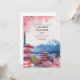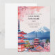 This wedding invitation features a japanese landscape of a traditional structure with sakura trees near it and a mountain in the background.