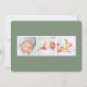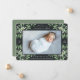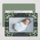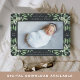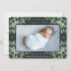 Elégant faire-part de naissance botanique dans les tons verts chic dispose d'un seul fond de saignement horizontal ou orienté paysage avec des grappes de délicats feuilles couleur vert sauge poussiéreux et des baies blanches aux coins, contre un riche arrière - plan de charbon de bois. Personnalisez avec le nom du bébé, les statistiques de naissance et un message personnel, et ajoutez trois photos carrés supplémentaires au dos.