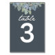 Jolie carte de numéro de table dans des tons doux, vintages de bleu-gris, vert olive et violets poussiéreux sur un joli arrière - plan dans une teinte gris-bleu profond. Illustration originale de fleurs florales ornent le dessus avant et l'arrière du. L'élégante recherche manuscrite pour l'élément de texte fixe ajoute style et grâce. Parfait pour un mariage de printemps, d'été, d'extérieur, de soirée ou de jardin.
