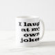 Avez-vous entendu celui au sujet de la personne qui a ri de ses propres plaisanteries ? Il a acheté cette tasse pour l'annoncer au monde. Le grand, audacieux, noir lettrage lit, "je ris de mes propres plaisanteries." Cela me rappelle… Un prêtre, un rabbin et un ministre notés sur Zazzle et chacun de eux ont commandé cette tasse. Ce qui ? Avez-vous dit quelque chose ? Vous allez devoir parler. Je ne peux pas vous entendre au-dessus du bruit de mon propre rire.