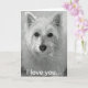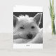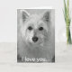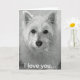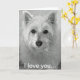 Une belle carte de voeux avec une photographie noire et blanche d'une stupéfaction, chien de regard innocent de Westie (montagne Terrier blanc occidentale) sur l'avant. Sur l'avant de la carte il a les mots "je t'aime…" dans le blanc. L'intérieur de la carte a été laissé le blanc pour vous possèdent le message spécial. Sur le dos de la carte est une autre image renversante de chien de Westie, expositions de cette image un petit chien de Westie refroidissant juste et détendant. Si vous recherchez une carte pour fondre le coeur de quelqu'un spécial puis ne regardez aucun autre, cette carte est sûr de capturer le coeur de chacun qui le reçoit.