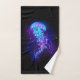 Grande méduse bleue, artistiquement dessinée, brillante, brillante, avec de longues tentacules sur arrière - plan noir avec bioluminescence violette. Méduse brillante.