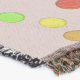 Les points dans les couleurs primaires (orange, rouge, violet, bleu, vert, jaune), sont en demi-cercle et répliqués en rangs diagonaux sur un arrière - plan violet-beige.